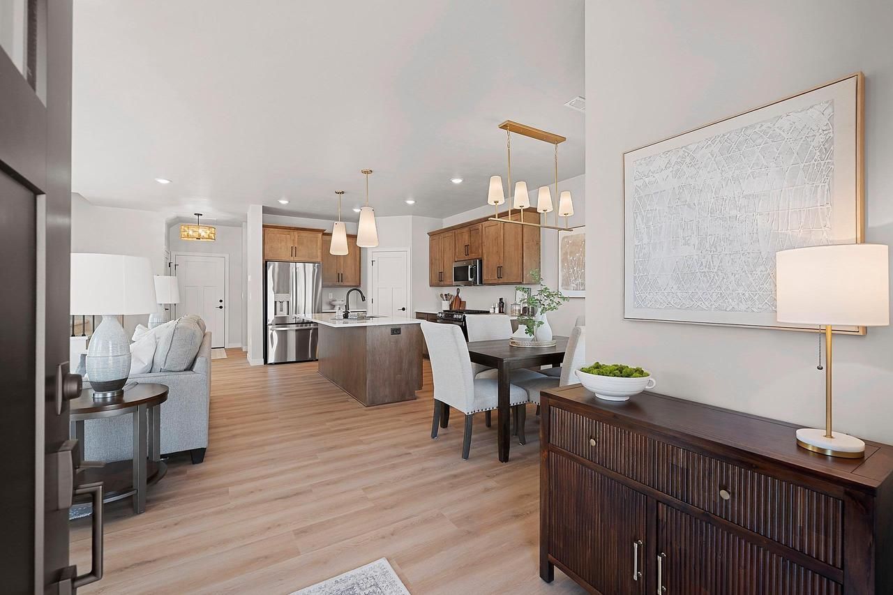 Enjoy the convenience of this gorgeous 3 bedroom, 2.5 bath Townhome in a desirable location near Howard Commons & walking trails. Features open concept design perfect for entertaining, along with stylish fireplace in Living Room for cozy evenings at home. Kitchen offers large center island, tile backsplash & abundant storage. Additional features are upper level primary suite with dual sinks & walk-in closet. Upper floor designed with laundry area & 2 additional bedrooms. Other amenities include zero-step entry w/ attached 2 car garage & 12x10' patio. Zero lot line property. Lawn maintenance & snow removal included. Move in & enjoy carefree living! Est. complete 3/25/26.